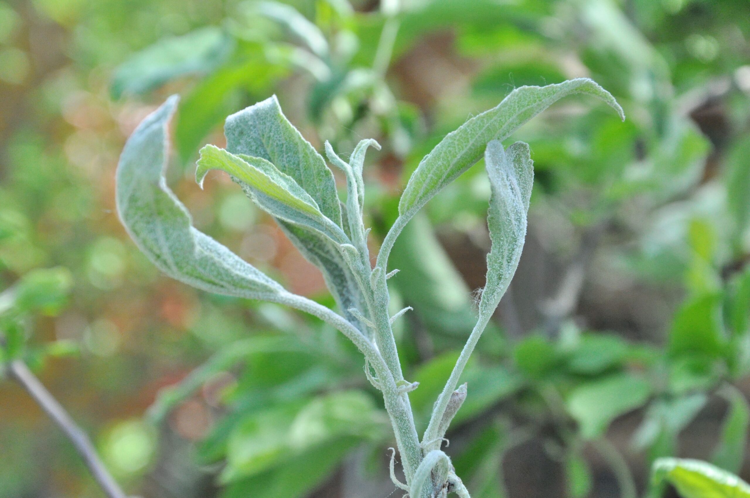 Jól látható az almafa lisztharmat fehér spóráinak sokasága a friss hajtásokon (Fotó: PNK)