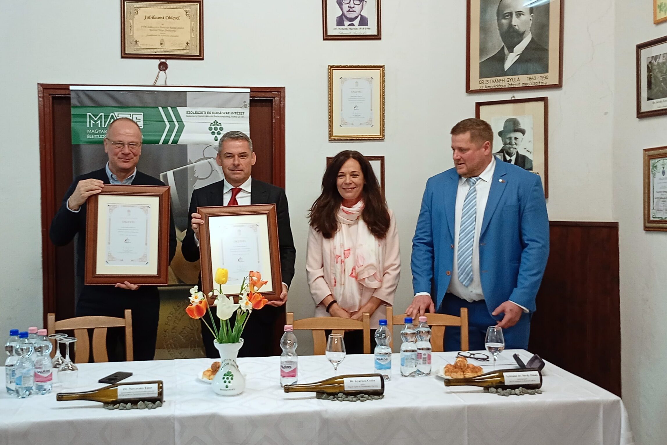 Nemrég vált hungarikummá a Kéknyelű, az erről szóló oklevél másolatát adta át a miniszternek és a rektornak Nyitrainé Sárdy Diána intézetigazgató és Szőke Barna állomásvezető