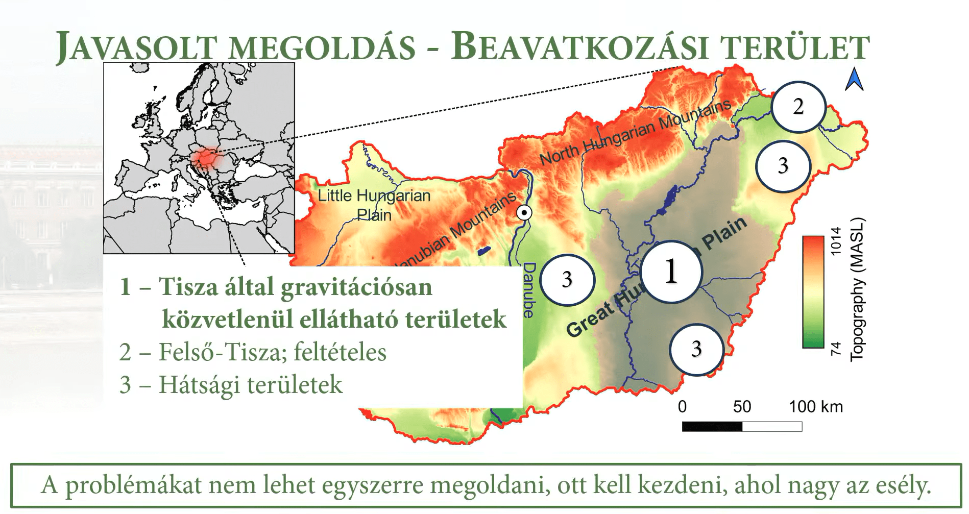 A térképen 1-essel jelölt területek gravitációsan közvetlenül elláthatók vízzel a Tiszából, melyek esetében a terület vízmérlegének helyreállítása hosszú távon cél. Ehhez több mint 2000 millió köbméter víz szükséges. Ennek módjai egyebek között az öntözés, a belvíz visszatartása – amely eltűnő jelenség, és egyben a hibás tájhasználat szinonimája –, illetve a duzzasztás. Ez utóbbi potenciált kínál, a mederben a hiánynál jóval kisebb mennyiség tározható, és a talajvizet csak lokálisan emeli. A szakember által javasolt megoldások köre három alappillérre épül, ezek a mélyárterek (előnyük a folyó menti elhelyezkedés, nagy tározási kapacitás, a táj hűtése a párolgás által), a háttértározók (természetes mélyületekben, elosztó és kiegyenlítő szereppel), és a beszivárogtató rendszer (nagy felület a több mint 10 ezer kilométer hossz miatt) kialakítása, kihasználása révén hozhatnának sikert.