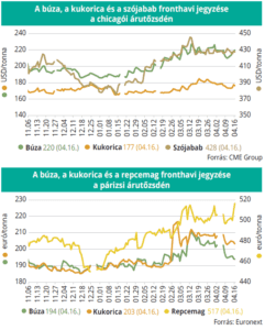 A chicagói árutőzsdén (CME/CBOT) a búza legközelebbi lejáratra szóló jegyzése 9 dollárral 220 dollár/tonnára, a kukoricáé pedig 2 dollárral 177 dollár tonnára nőtt április 9. és 16. között. A szójabab fronthavi kurzusa változatlanul 428 dollár/tonna volt ugyanekkor.