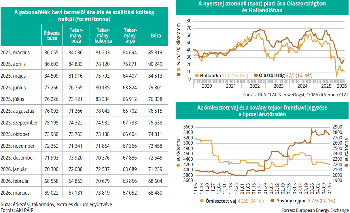 Az olaszországi Veronában a nyerstej azonnali (spot) piaci ára áfa nélkül, szállítási költséggel a 2025. 29. és a 2026. 11. hét között 46,5 euróval esett, a 16. hétig 6 euróval 27,5 euró/100 kilogrammra emelkedett. Hollandiában a 4,4 százalék zsírtartalmú nyerstej spot piaci ára áfa nélkül, szállítási költséggel a 2026. 7–9. hét között 8 euróval csökkent, majd nem változott jelentősen, a 16. héten 11 euró/100 kilogramm volt.