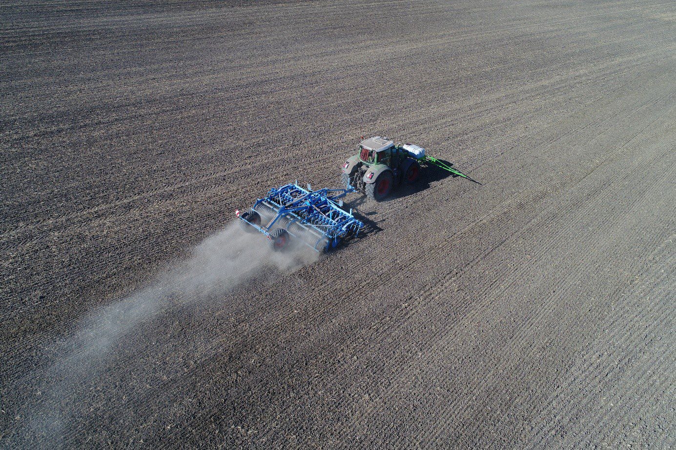 A kijuttatási technológia betartása ezért elengedhetetlen. (1. sz. kép) A készítményeket a gyártó előírásai szerint kell tárolni, kerülve a hőingadozást. A talajoltást célszerű a vetéselőkészítéssel egy menetben elvégezni, így a baktériumok gyorsan a talajba kerülnek, és csökken a kiszáradás veszélye. A megfelelő dózis betartása alapfeltétel, a készítményt pedig kijuttatás előtt fel kell rázni. A kijuttatás ideje is meghatározó, a kora reggeli vagy késő délutáni időpontok kedvezőbbek, mert ilyenkor alacsonyabb a hőmérséklet és az UV sugárzás. A kissé nedves talaj a legideálisabb, de szárazabb körülmények között nagyobb vízmennyiséggel is kijuttatható a készítmény, ha a technológia ezt lehetővé teszi. A kipermetezés után a baktériumokat mielőbb be kell dolgozni a talajba – már néhány centiméter takarás is elegendő ahhoz, hogy védve legyenek a környezeti hatásoktól.