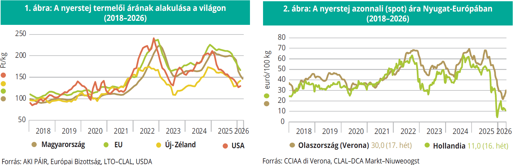 A nyerstej termelői ára nemzeti valutában kifejezve 2026 februárjában az USA-ban 22,5 százalékkal, az Európai Unióban 18,3 százalékkal, Új-Zélandon 3 százalékkal csökkent az előző év azonos hónapjához képest (1. ábra). Az AKI PÁIR adatai szerint Magyarországon a nyerstej kiviteli ára 113,03 forint/kilogramm volt 2026 márciusában, az előző havitól 2,8 százalékkal, az előző év azonos hónapjától 37,6 százalékkal maradt el. A kiviteli ár 22,9 százalékkal volt alacsonyabb a termelői átlagárnál.