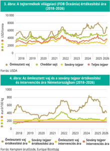 A világpiacon a sovány tejpor értékesítési ára (FOB Óceánia) 2026 15. hetében 22,8 százalékkal emelkedett, míg a cheddar sajté 5,2 százalékkal, a teljes tejporé 7,8 százalékkal, az ömlesztett vajé 11,2 százalékkal mérséklődött 2025 azonos hetéhez mérten (3. ábra). Németországban az ömlesztett vaj értékesítési ára 2026 16. hetében az előző év azonos hetéhez viszonyítva 43,3 százalékkal csökkent, míg a sovány tejporé 12,8 százalékkal nőtt.